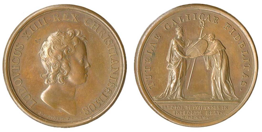 France. Louis XIV (1643-1715). Restoration of the Elector of Trier, 1645. Bronze. 41 mm. By J. Mauger. Boy head of the "Sun King" right, rev. France, standing right, presenting shield and sword of Trier to the Archbishop, who holds a crozier. Plain edge. Divo 18. Lovely chestnut-brown. Choice Uncirculated.