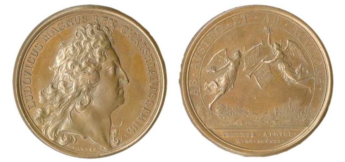 France. Louis XIV (1643-1715). Nice and Mons Captured on the Same Day, 1691. Bronze. 41 mm. By J. Mauger. Peruked, older head right, rev. Two angels, one flying right, the other left, above the cities of Nice and Mons, holding mural crowns and banners on their trumpets inscribed with notice of the capture of the two cities. Plain edge. Divo 237. Rich deep milk chocolate-brown with orange highlights. Lustrous Uncirculated