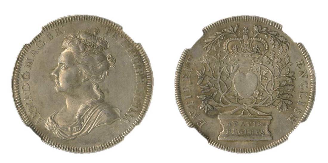 Great Britain. Accession of Queen Anne, 1702. Silver. 35 mm. By J. Croker. Crowned and draped bust left, rev. Heart within oak branches, resting on a pedestal inscribed ATAVIS REGIBVS, and threaded through crown; ENTIRELY ENGLISH around. Eimer 388, MI ii 227/1, v. Loon IV, 345. Pleasing light slate gray with pearlescent lustre. NGC AU 58.