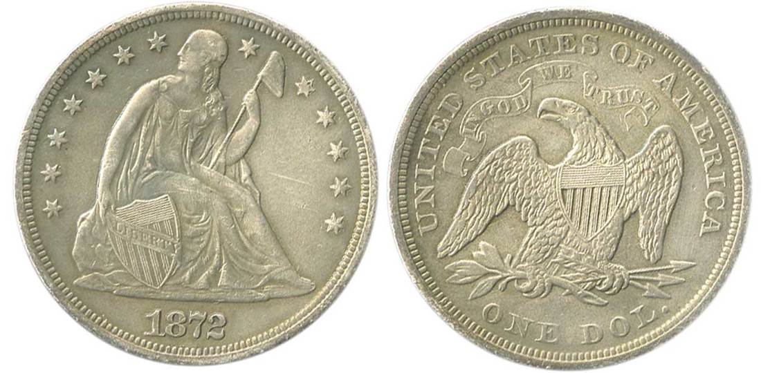 1872 Seated Liberty Dollar. Small, but noticeable slidemark across Liberty's waist and legs into field. Coin has the appearance of a bright, uncirculated example, but may have been lightly polished at some point in the past. About Uncirculated.