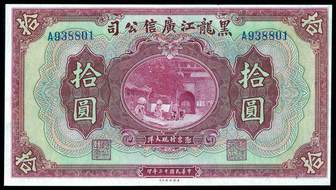China. Kwang Sing Company - Kuang Hsin Syndicate of Heilungkiang. 10 Dollars. 1924. P-S1603c. No. A938801. Red and multicolor, blue back. "Big Money" issue. Lion statues near city tower gate at center. PMG Very Fine 30.
