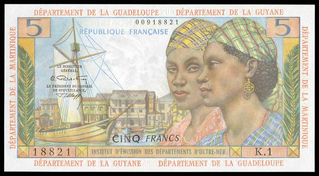 French Antilles. Institut D'Emission Des Départments D'Outre-Mer République Francaise. 5 Francs. ND (1964). P-7b. Brown on multicolor underprint. Two women, wearing head kerchiefs at right, sailboat at left; ox carts with drivers. Gem Crisp Uncirculated.