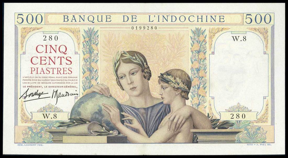 French Indo-China. Banque de l'Indo-Chine. 500 Piastres. ND (1939-). P-57. Multicolor. Woman with child, both laureate, examining globe, two elephants behind woman and child on back. Light discoloration stripe back center. PMG About Uncirculated 53.