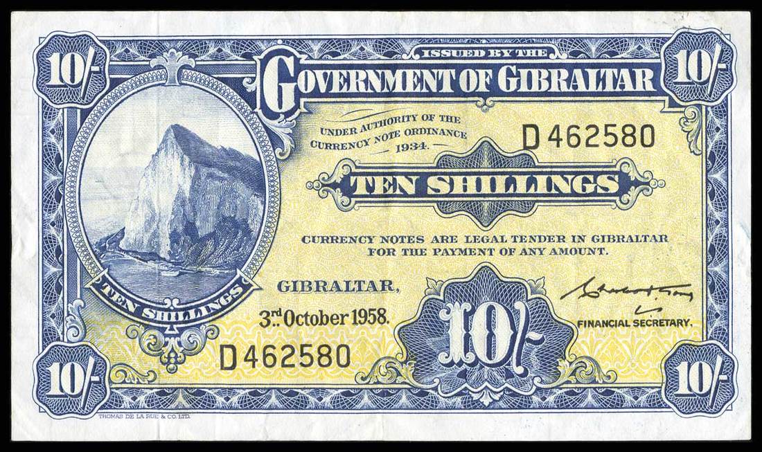 Gibraltar. Government of Gibralter. 10 Pounds. 3-10-1953. P-19a. Blue on yellow. Rock of Gibraltar. Very Fine. Small edge split.