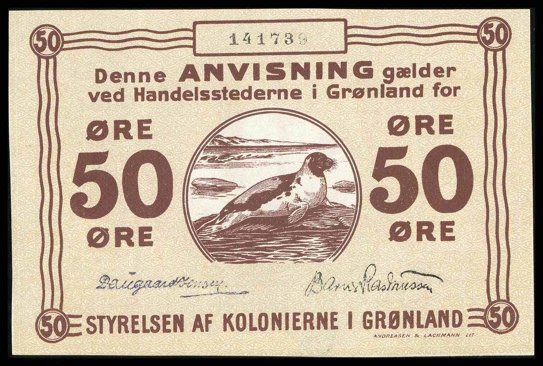Greenland. Styrelsen Af Kolonierne I Grønland. State Note. 50 Øre. 1913. P-12d. Large signature - Daugaard Jensen-Barner Rasmussen. Brown. Saddleback seal on ice at center. About Uncirculated, minor handling, fresh and original.