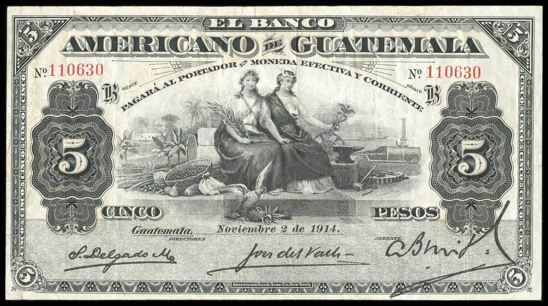 Guatemala. Banco Americano de Guatemala. 5 Pesos. 1914. P-S112b. Agriculture and Commerce seated at center, three mountains on back overlooking village and train chugging in, Guatemala Arms at left, U.S. Arms at right. Scarce ABNC note. Good Fine.