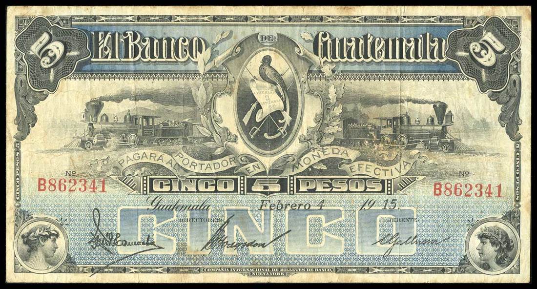 Guatemala. Banco de Guatemala. 5 Pesos 1915. P-S143c. Arms flanked by steam locomotives, small vignettes of woman's head bottom left and right. Rare. Light stains, Good Fine.