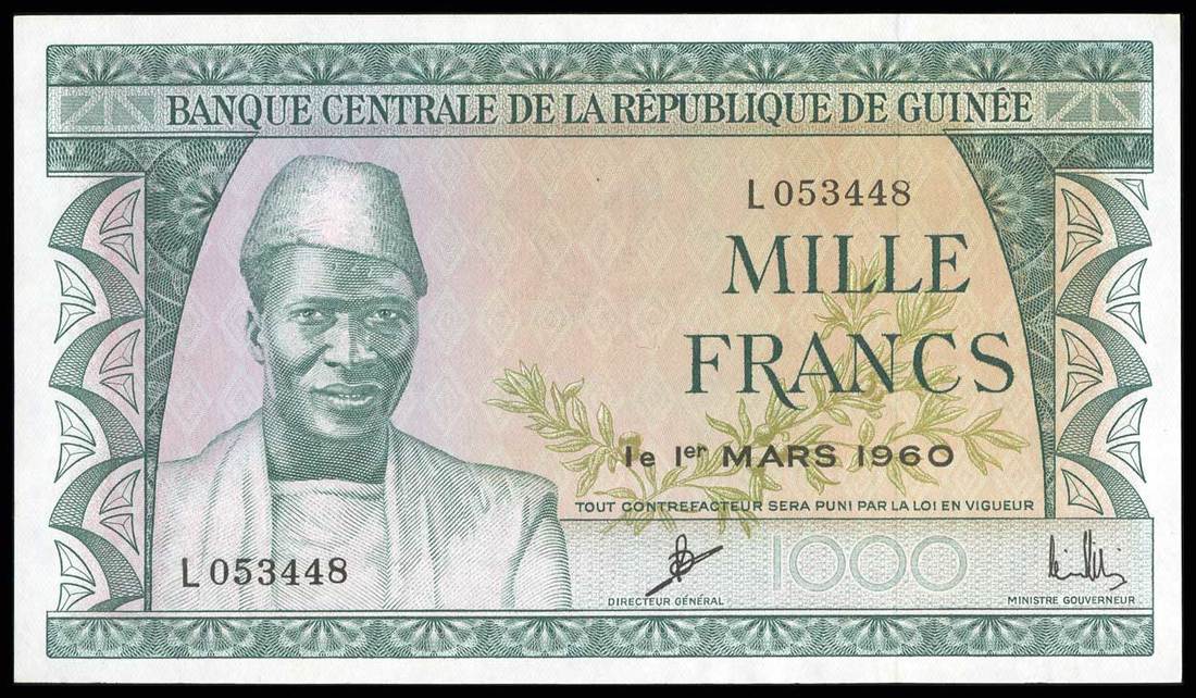 Guinea. Bank Centrale de la Republique de Guinee. 1000 Francs. 1-March-1960. P-15a. No. L053448. Green on multicolor underprint. President Sekou Toure. Banana harvesting on back. Choice Uncirculated.