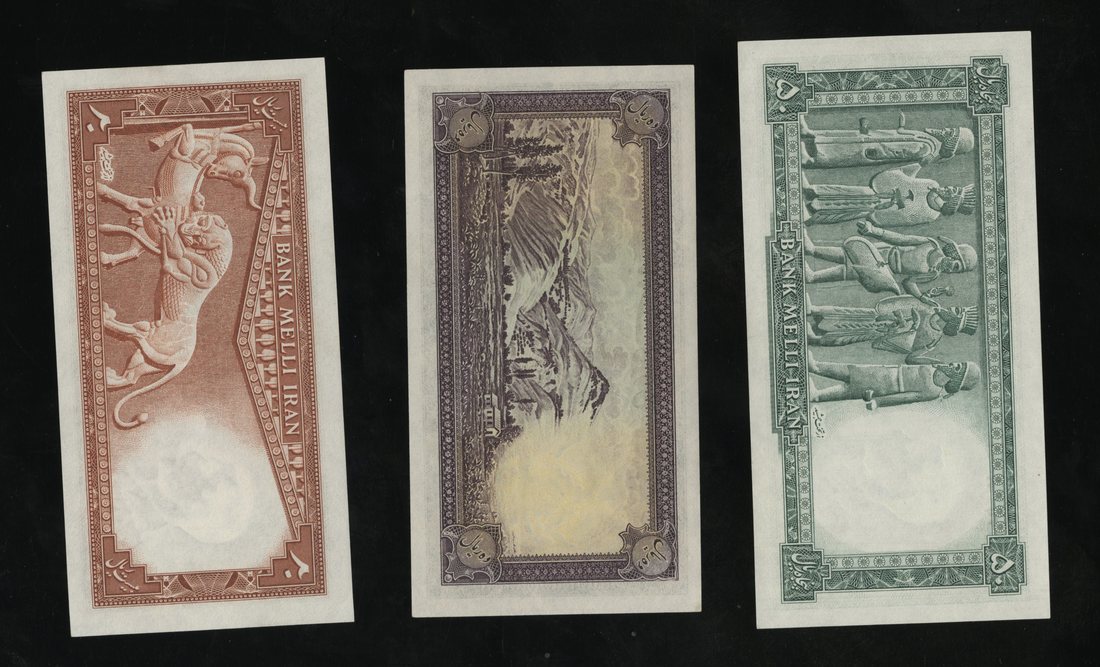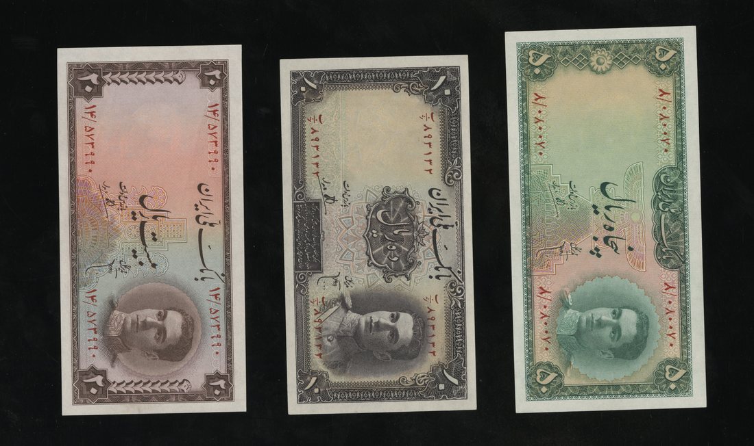 Iran. Scarcer High Grade Bank Melli Iran Trio. P-40 10 Rials (1944); P-48 20 Rials (1948); P-49 50 Rials (1948). All Choice to Gem Uncirculated [3]