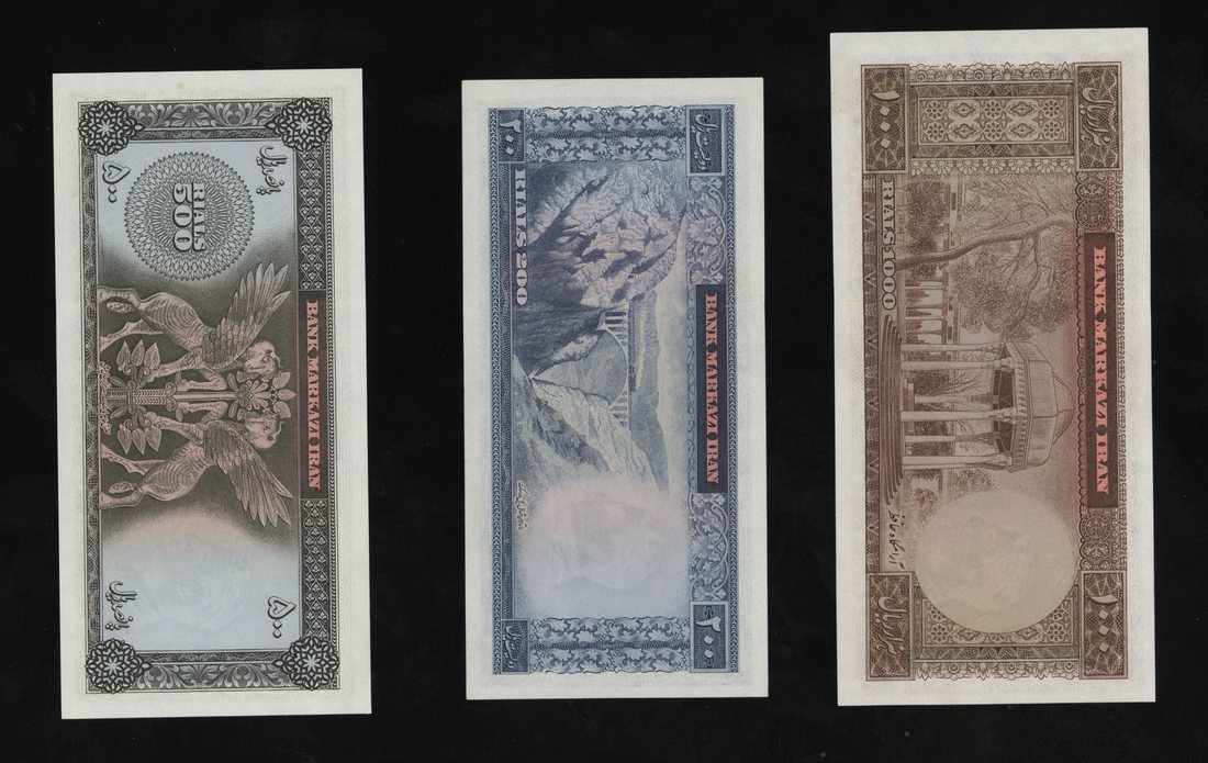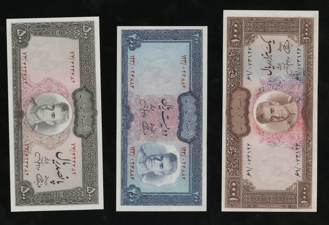 Iran. Scarce Bank Markazi Note Trio (1971-1973). P-92a 1000 Rials; P-93a 500 Rials; P-94a 1000 Rials. All Choice to Gem Uncirculated. [3]