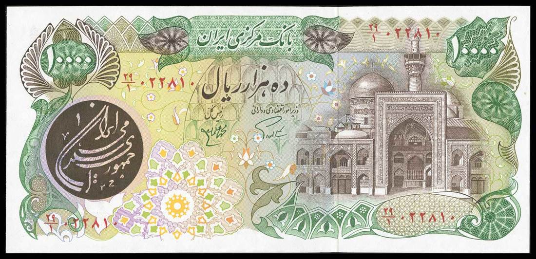Iran. Bank Markazi. 10,000 Rials. (1981). P-131a. Dark brown circular seal, left. National Council of Ministries, back. Choice Crisp Uncirculated.