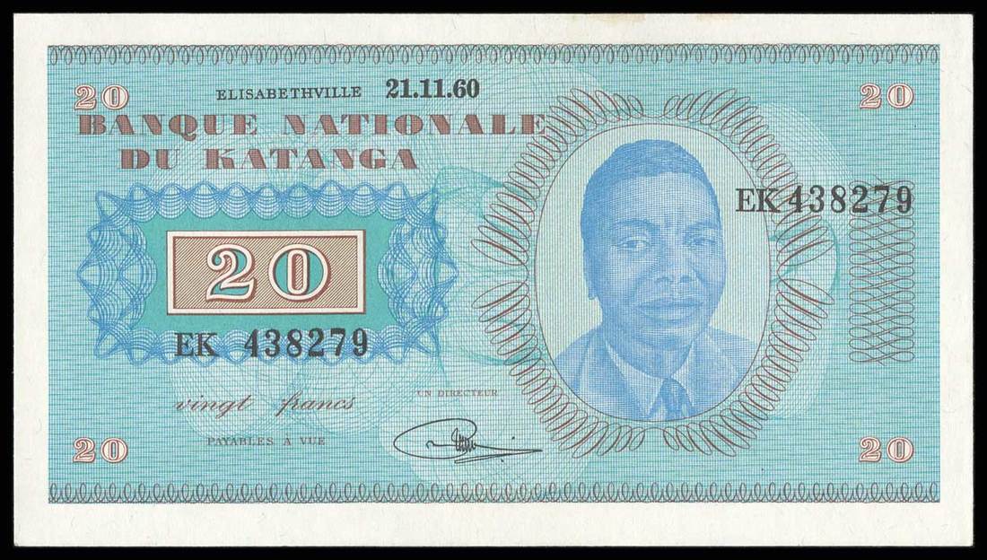 Katanga. Banque Nationale Du Katanga. 20 Francs. 1960. P-6a. Blue-green and brown. Portrait of Moise Tshombe center right; building on back. Crisp Uncirculated, very light age toning.