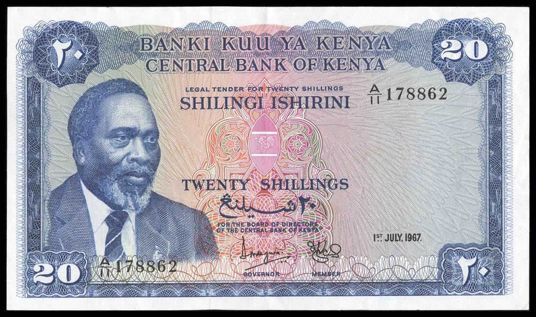 Kenya. Banki Kuu Ya Kenya. 20 Shilingi. 1-7-1967. P-3b. Blue on multicolor. Kenyata, left. Plants and train. Almost Uncirculated.