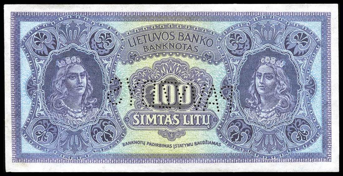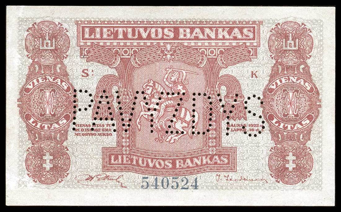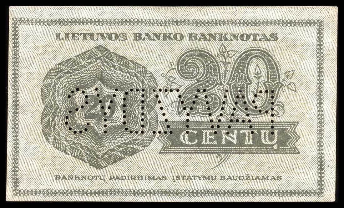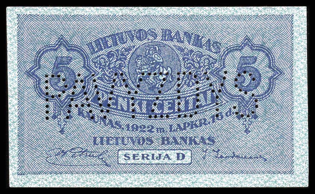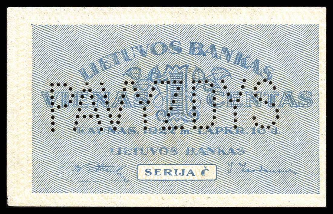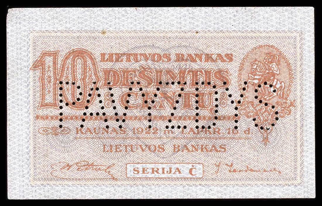 Lithuania. Bank of Lithuania. Set of SPECIMENS of the November 1922 issue, missing only the 5 Litai color varieties. Includes: 1 Centas, 2 Centu, 5 Centai, 10, 20 and 50 Centu; 1 Litas, 2 Litu, 5 Litai, 10, 50 and 100 Litu. P-7s1, 8s1, 9s1, 10s1, 11s1, 12s1, 13s1, 14s1, 15s1, 18s1, 19sl, 20s1. Lithuanian horseman Arms, workers, Grand Duke Gediminas, Vytautas the Great. All perforated PAVYZDYS. The 5 Centai, 20 Centu, and 2 Litu deep royal blue; the 10 Centu and 1 Litas reddish brown. Mixed serial numbers. Slight age toning in margins. AU-Uncirculated. Unusual and scarce. [12]