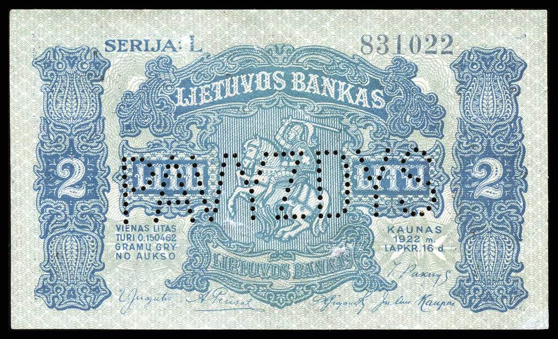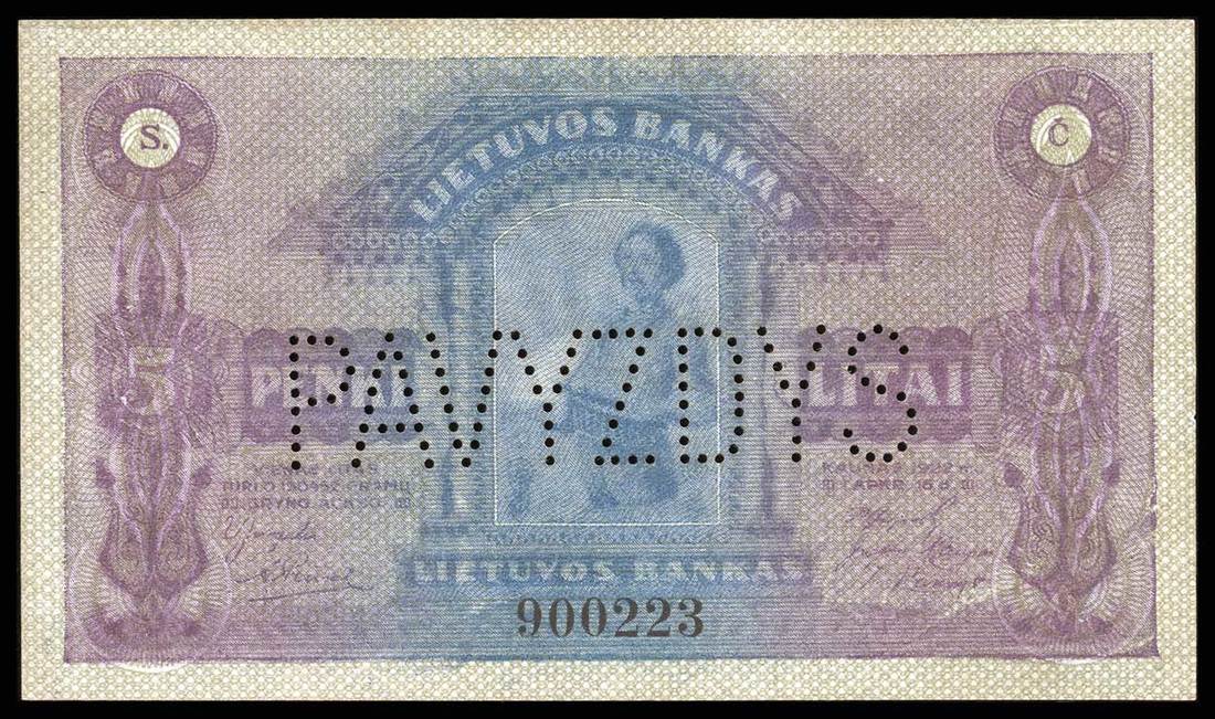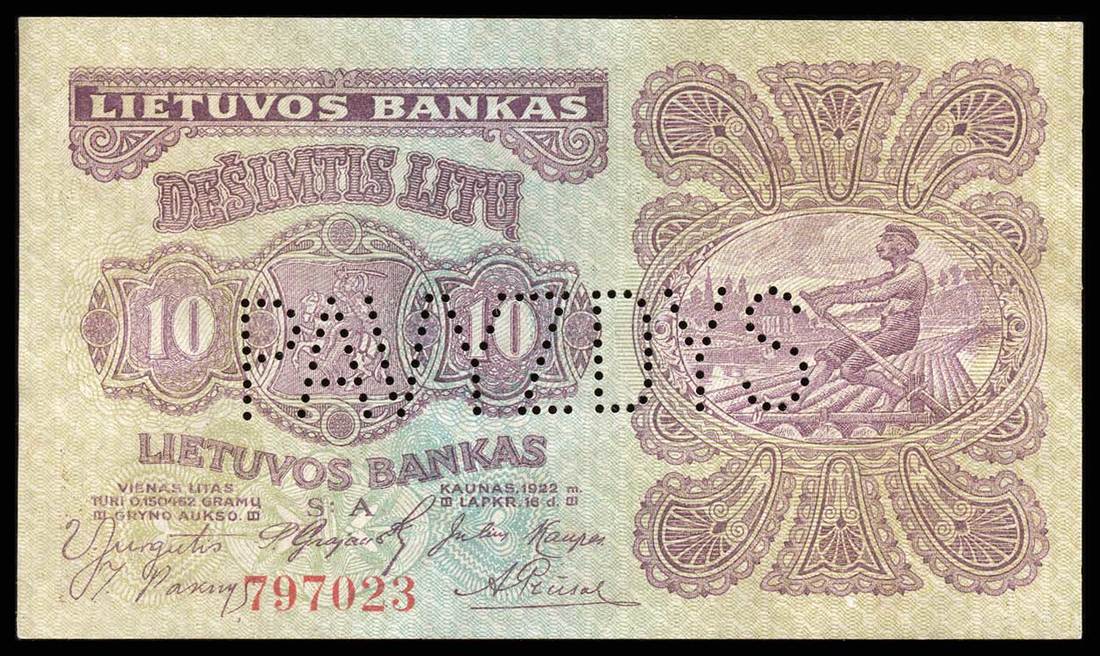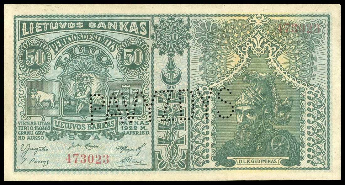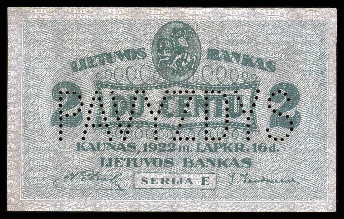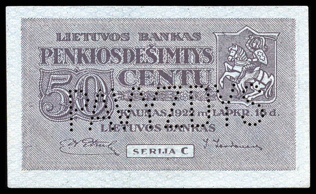 Lithuania. Bank of Lithuania. Set of SPECIMENS of the November 1922 issue, missing only the 5 Litai color varieties. Includes: 1 Centas, 2 Centu, 5 Centai, 10, 20 and 50 Centu; 1 Litas, 2 Litu, 5 Litai, 10, 50 and 100 Litu. P-7s1, 8s1, 9s1, 10s1, 11s1, 12s1, 13s1, 14s1, 15s1, 18s1, 19sl, 20s1. Lithuanian horseman Arms, workers, Grand Duke Gediminas, Vytautas the Great. All perforated PAVYZDYS. The 5 Centai, 20 Centu, and 2 Litu deep royal blue; the 10 Centu and 1 Litas reddish brown. Mixed serial numbers. Slight age toning in margins. AU-Uncirculated. Unusual and scarce. [12]