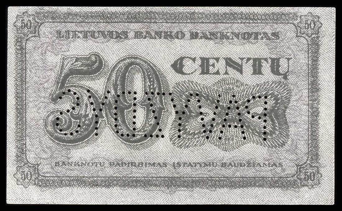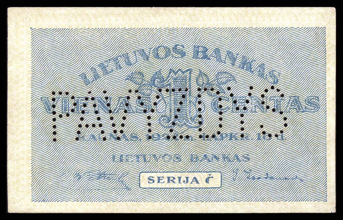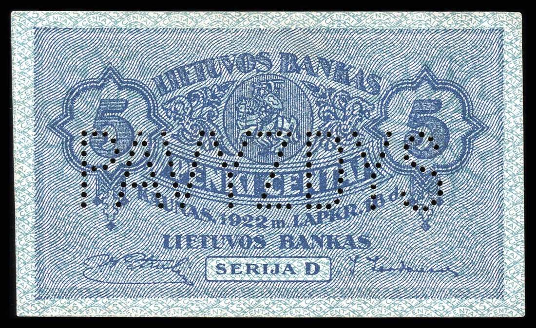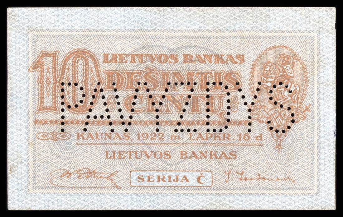 Lithuania. Bank of Lithuania. Set of SPECIMENS of the November 1922 issue, missing only the 5 Litai color varieties. Includes: 1 Centas, 2 Centu, 5 Centai, 10, 20 and 50 Centu; 1 Litas, 2 Litu, 5 Litai, 10, 50 and 100 Litu. P-7s1, 8s1, 9s1, 10s1, 11s1, 12s1, 13s1, 14s1, 15s1, 18s1, 19sl, 20s1. Lithuanian horseman Arms, workers, Grand Duke Gediminas, Vytautas the Great. All perforated PAVYZDYS. The 5 Centai, 20 Centu, and 2 Litu greenish blue; the 10 Centu and 1 litas tan brown. Minor age toning in margins. AU-Uncirculated. Scarce and unusual. [12]