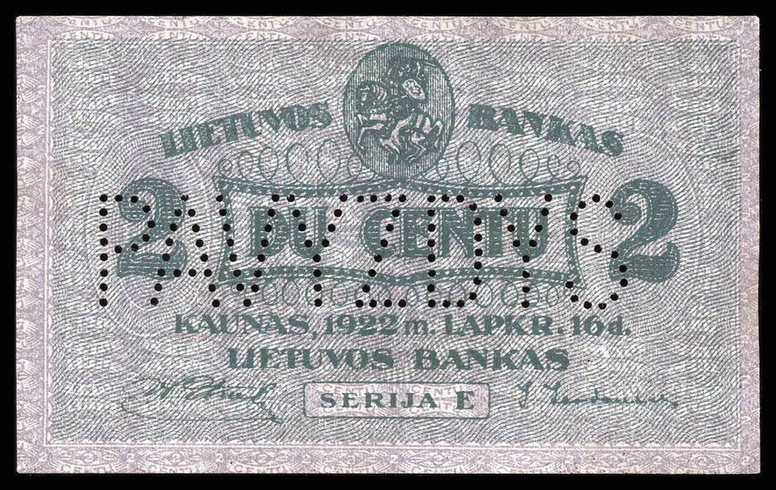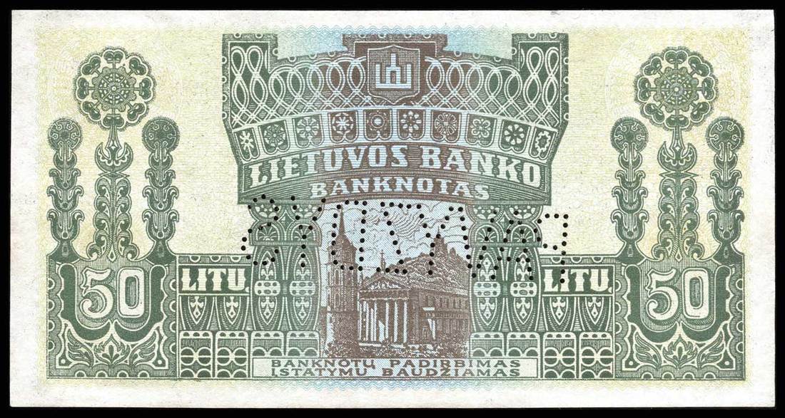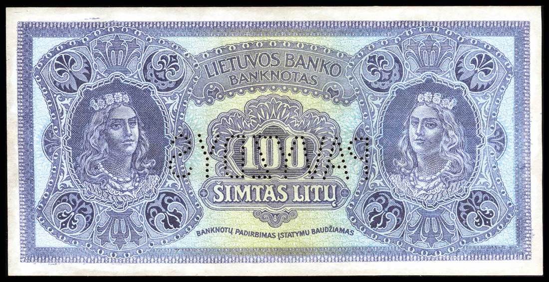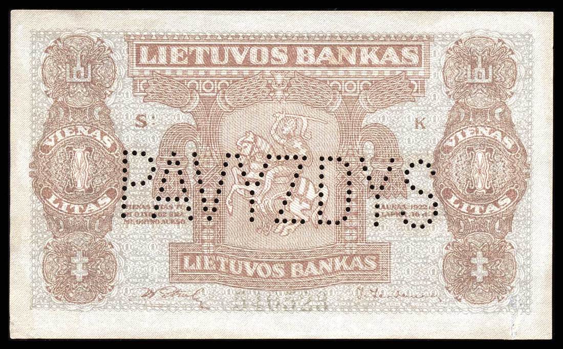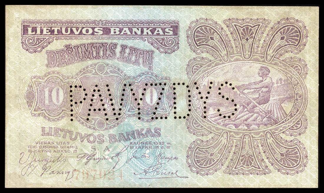 Lithuania. Bank of Lithuania. Set of SPECIMENS of the November 1922 issue, missing only the 5 Litai color varieties. Includes: 1 Centas, 2 Centu, 5 Centai, 10, 20 and 50 Centu; 1 Litas, 2 Litu, 5 Litai, 10, 50 and 100 Litu. P-7s1, 8s1, 9s1, 10s1, 11s1, 12s1, 13s1, 14s1, 15s1, 18s1, 19sl, 20s1. Lithuanian horseman Arms, workers, Grand Duke Gediminas, Vytautas the Great. All perforated PAVYZDYS. The 5 Centai, 20 Centu, and 2 Litu greenish blue; the 10 Centu and 1 litas tan brown. Minor age toning in margins. AU-Uncirculated. Scarce and unusual. [12]
