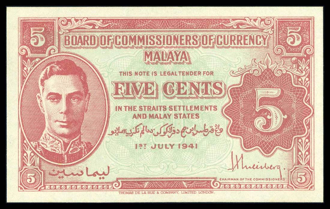 Malaya. Board of Commissioners of Currency. 5 Cents. 1941. P-7b, KNB7b-d. Red on light green underprint. Portrait of George VI at left. PMG Superb Gem Unc. 67 EPQ. The finest graded in the PMG census.