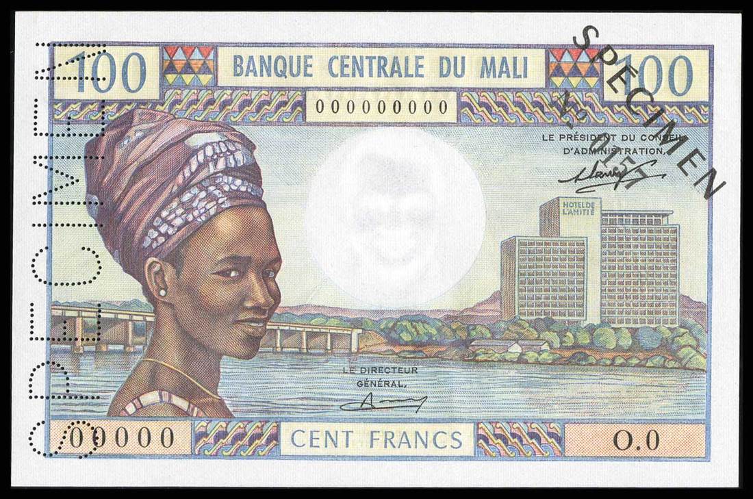 Mali. Banque Centrale du Mali. 100 Francs. (1972-1973). P-11s. Specimen. Brown and multicolor. Woman, left, hotel right. Woman left, boats on back. Choice Crisp Uncirculated. Extremely Scarce.