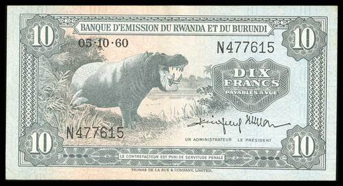 Rwanda-Burundi. Banque d'Emission du Rwanda et du Burundi. 10 Francs. 1960. P-2a. Gray on pale blue and orange underprint. Hippopotamus, mouth agape, at left, value at right and in each corner. Good EF, and quite high-grade for type.