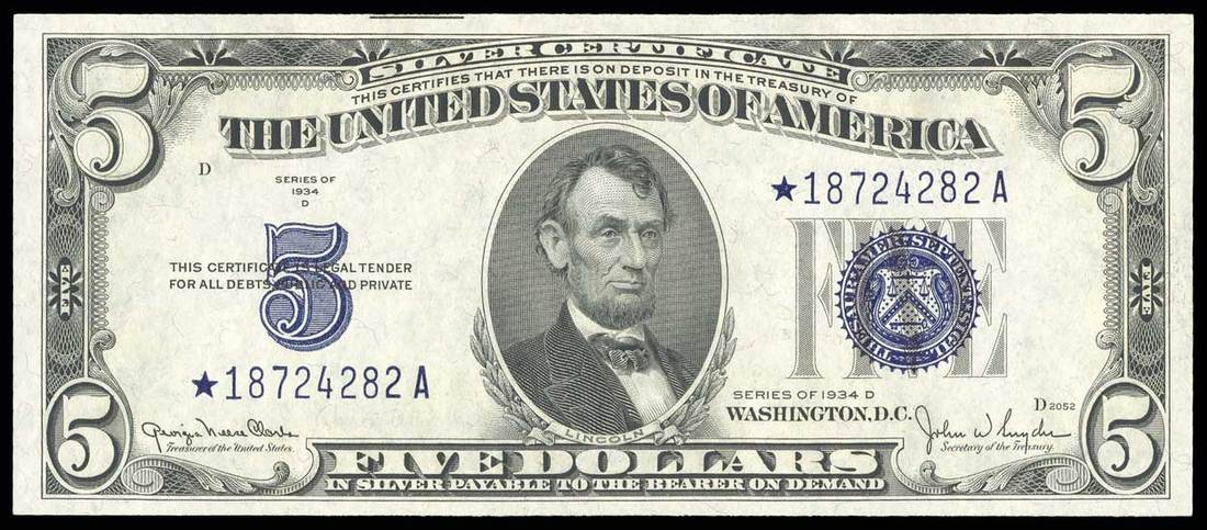 Fr.1654*. $5. Silver Certificate. 1934D STAR. Lincoln. Blue seal. No. *18724282A D. Choice Uncirculated. A lovely example of this elusive STAR note.