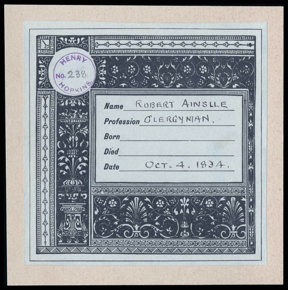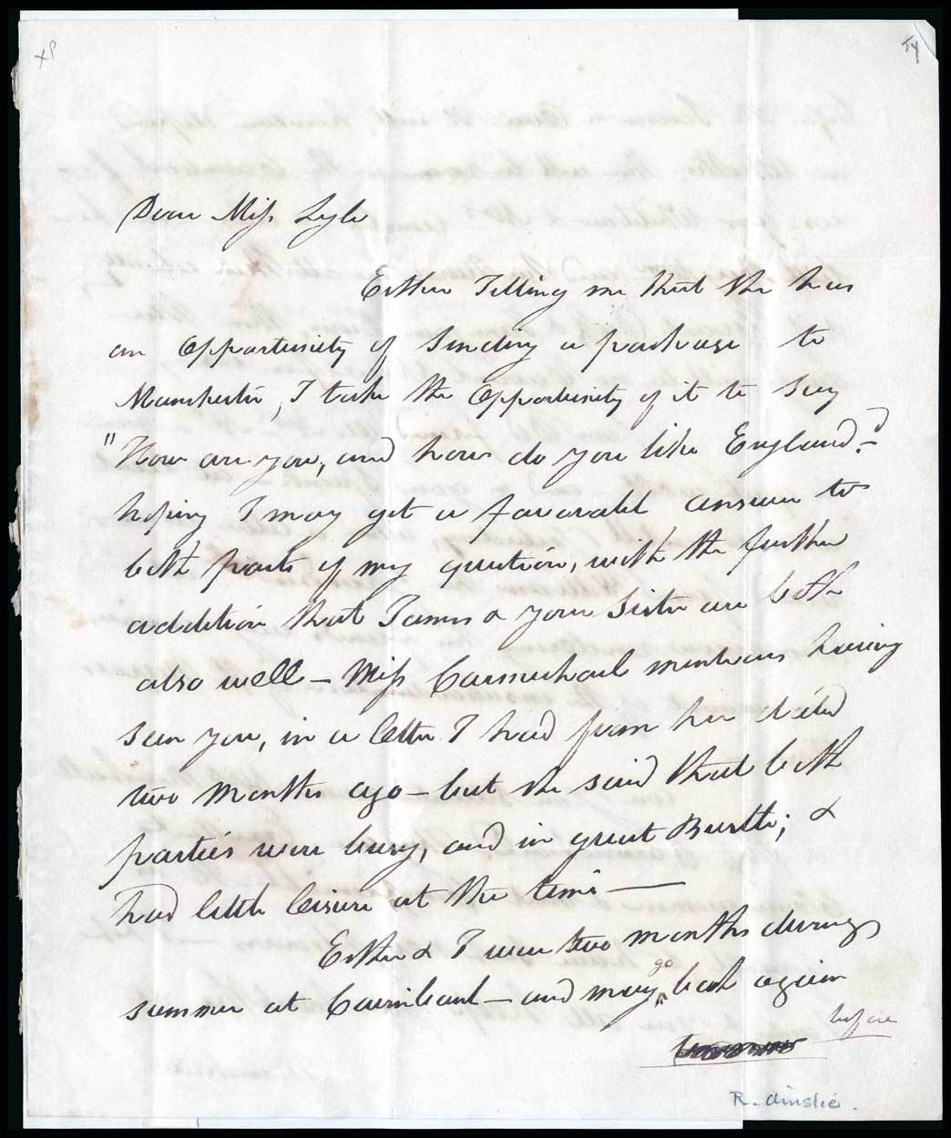 Ainslie, Robert (1766-1838). Scottish clergyman, writer, and an acquaintance of Robert Burns, national poet of Scotland. ALS, 3pp, 4to. Edinburgh. October 4, 1834. To Miss Lyle. "Esther telling me that she has an opportunity of sending a package to Manchester, I take the opportunity of it to say "How are you, and how do you like England?" Ainslie reacting to a letter received by Miss Lyle's friend's grandson that contains news of an insurrection in Demerara (British Guyana) writes "…rendering his friends my enemies on account of the insubordination of the Negroes there." (On August 1, 1834, the law abolishing slavery throughout the British Empire took effect.) Also included is a 4" x 4" partially printed form with "Name "ROBERT AINSLIE," Profession "CLERGYMAN," and Date "Oct. 4, 1834" entered in ink, and mounted on a card.