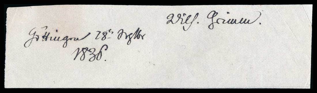 Grimm, Jacob and Wilhelm (Jacob 1785-1863 and Wilhelm 1786-1859). Among the best known story tellers of folk tales, including "Cinderella", "The Frog Prince", "Hansel and Gretel", and "Snow White". Clipped signatures. One dated 1838. Ex. Lot 77, R. M. Smythe & Co. Sale #256, Nov. 16, 2005.