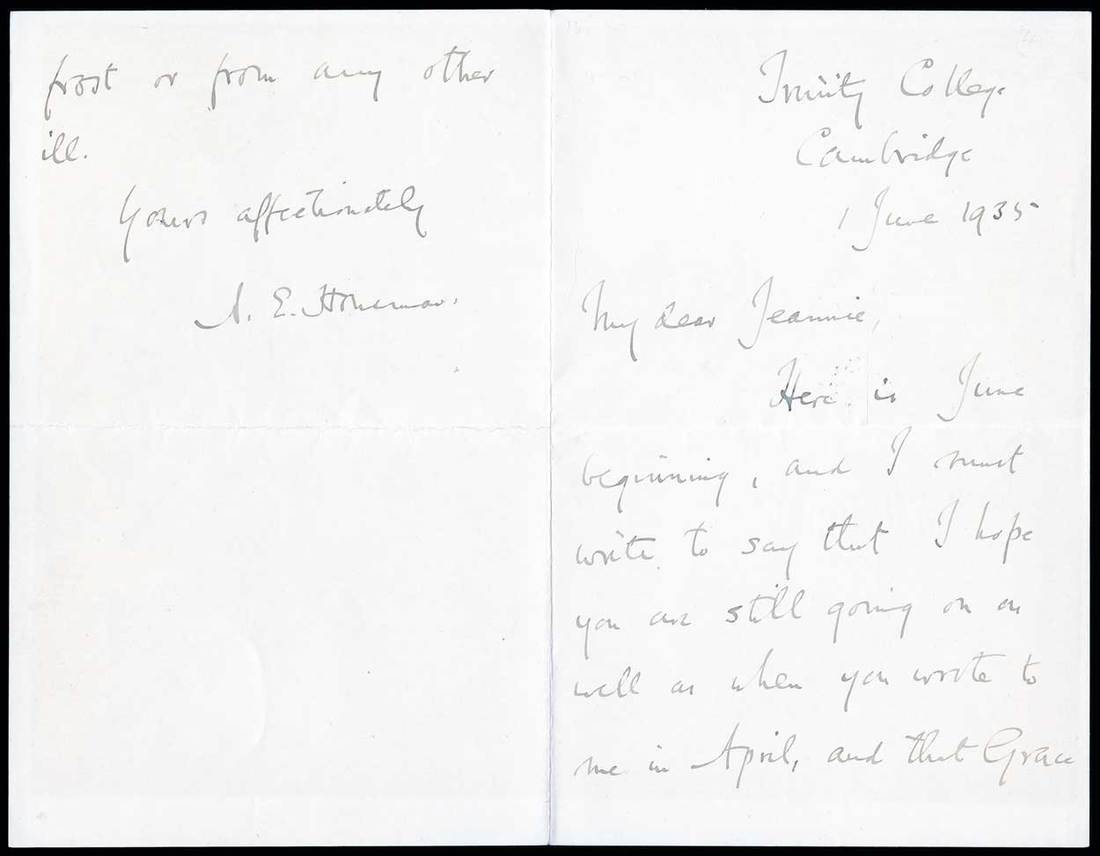 Housman, Alfred E. (1859-1936) English poet and scholar. ALS, 3 ½ pp, 8vo. Trinity College, Cambridge. June 1, 1935. To his sister-in-law, Jeannie Housman.