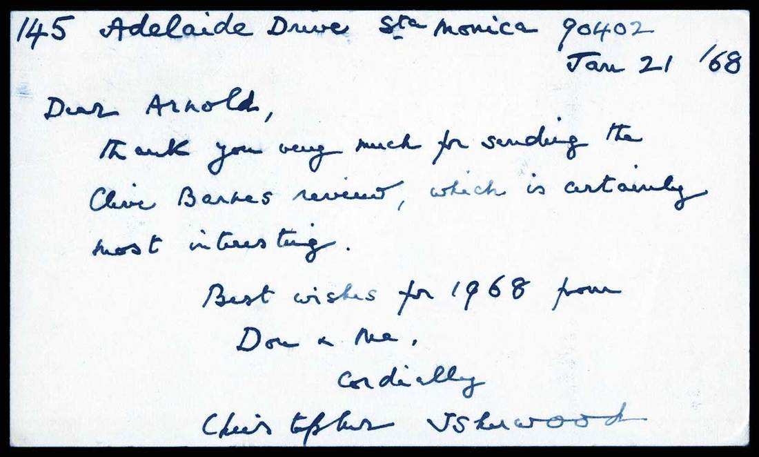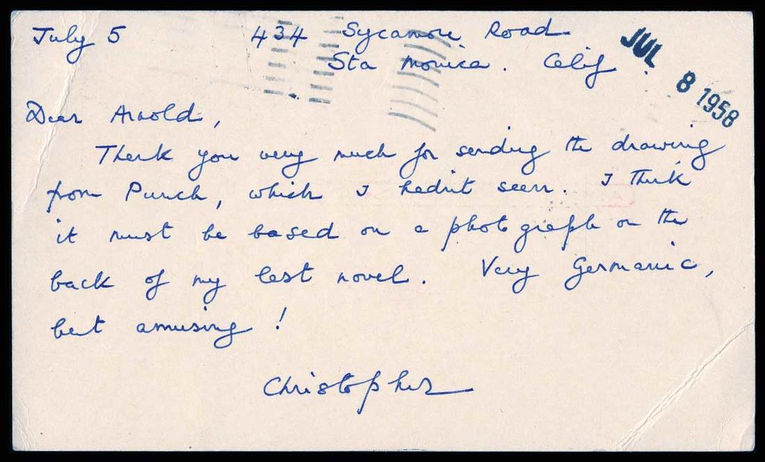 Isherwood, Christopher (1904-1986). English novelist. He was a friend of Truman Capote and Aldous Huxley. ALS. Two postcards, July 8, 1958 and January 21, 1968. Both to W. L. Arnold Weissberger, author of "Famous Faces". In the first card, signed "Christopher," Isherwood thanks Weissberger for sending a drawing from Punch. "…Very germanic, but amusing!" In the second post card he thanks him for sending Clive Barnes' review "…which is certainly most interesting."