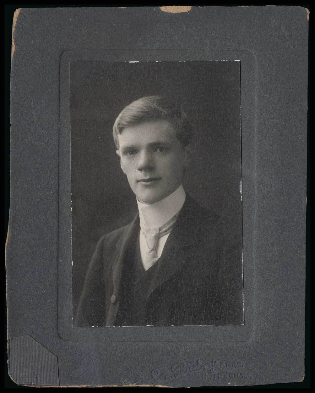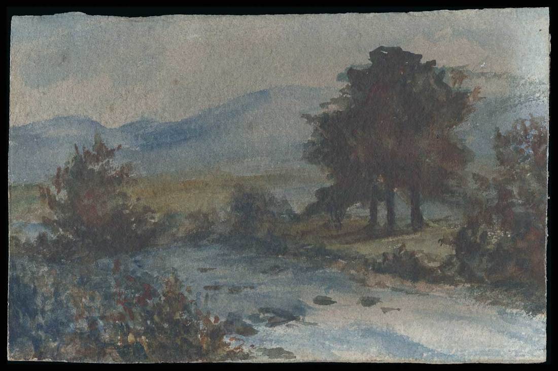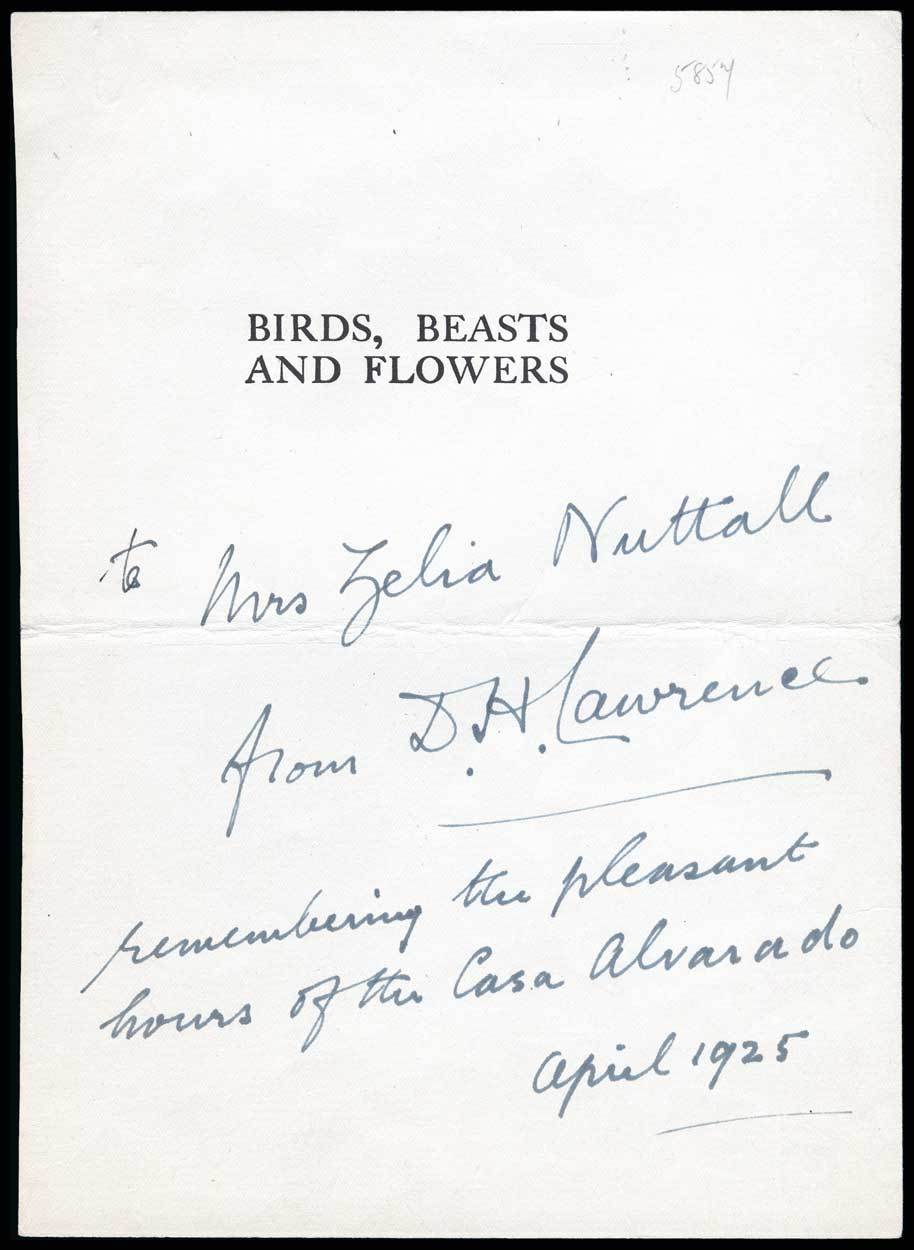 Lawrence, D.H. (1885-1930) English novelist, playwright, poet, essayist, critic and painter. Author of "Lady Chatterley's Lover". Sentiment, in his hand, on a 6" x 8" page imprinted with the title of his 1923 book of poems Birds, Beasts and Flowers. April 1925. To Mrs. Zelia Nuttall."…from D. H. Lawrence remembering the pleasant hours of the Casa Alvarado." Also included is a photograph mounted on a cardboard frame, signed on the verso twice, "D. H. L." and "[D.] H. Lawrence." This remarkably young image of Lawrence is inscribed to his childhood neighbors - "Dear little Mabel & Lovely Emmie." In addition, there is a small watercolor landscape, 5" x 3 ¼," unsigned, but believed to be by Lawrence.