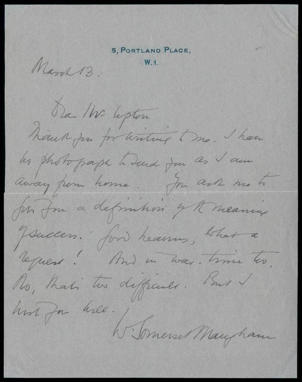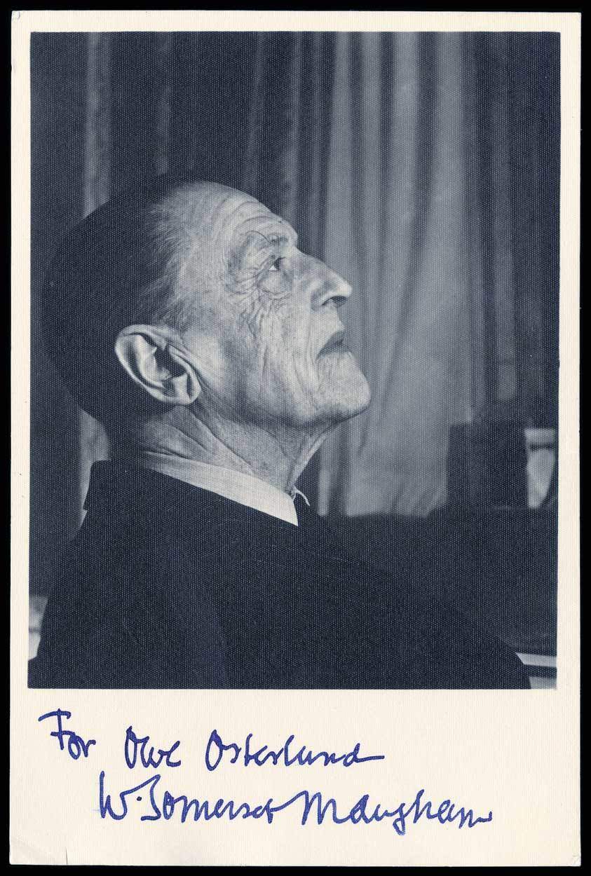 Maugham, William Somerset (1874-1965). British novelist, playwright and short story writer; perhaps the most popular writer of his time period. Author of "Of Human Bondage", and over two hundred other books, plays and articles. ALS, 8vo. 5 Portland Place, W. 1. To Mr. Lipton. "March 13." [1940-45]. Very fine condition. "…You ask me for a definition of the meaning of success. Good heavens, what a request! And in war-time, too. No that's too difficult. But I wish you well. W. Somerset Maugham." Included is a photograph of Maugham with "For Olive Osterland, W.Somerset Maugham" at the bottom.