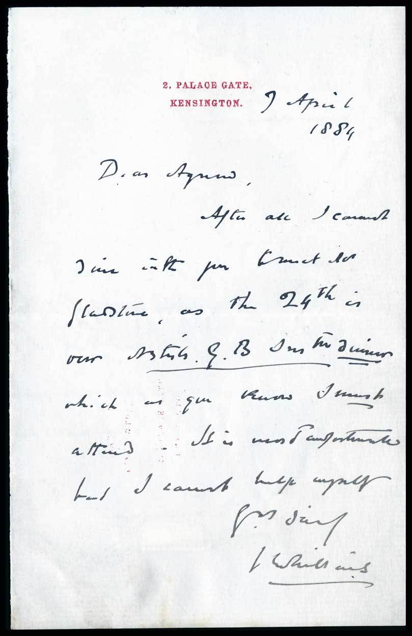 Millais, J.E. (1829-1896). English painter and illustrator. One of the founders of the Pre-Raphaelite Brotherhood. Member of the Royal Academy of Art. ALS, 8vo. 2 Palace Gate, Kensington. April 7, 1884. Millais declines an invitation. Also included is an original cabinet photograph of the artist by the London Stereoscopic & Photographic Company of 110 & 108 Regent Street, Cheapside, no date. Millais is shown, from his left, in a seated half-length portrait. Mounted to the photographer's printed card mount. In very good condition. Millais illustrated several of Trollope's novels, including Orley Farm, Framley Parsonage, The Small House at Allington, Rachel Ray, and Phineas Finn.