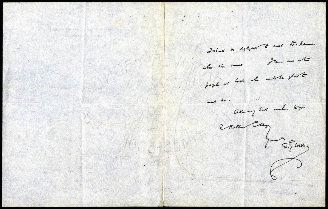 Wells, Herbert George (1866-1946). English writer best remembered for his science fiction works including "The Time Machine", "The Island of Dr. Moreau", "The Invisible Man" and "War of the Worlds". ALS, 2 pages, 8vo. 47 Chiltern Court, Clarence Gate N. W. 1. July 15, 1935. To Hamilton Holt. "You do me much honor. I would like to visit you in Florida some time, but I don't see myself with an honorary university degree. I've never had anything of the sort suggested before. I've backed out from the O. M. Oxford, Cambridge, London, the Royal Society know me not. I think I had better remain plain and unadorned. I shall be delighted to meet Dr. Newman when she comes. I know one of the people at Exeter who would be glad to meet her. All my best wishes to you and Rollins College. Yours, H. G. Wells." Ink stain in the left margin of the first page, otherwise very fine.
