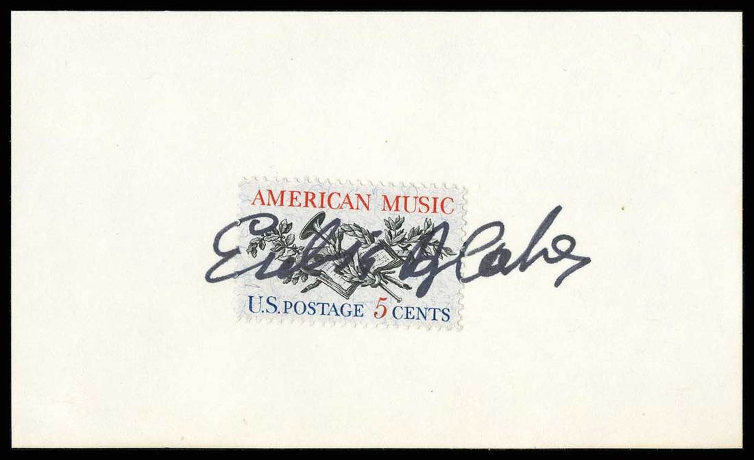 Blake, James Hubert "Eubie" (1887-1983). Legendary composer, lyricist and ragtime and jazz pianist; together with Noble Sissle, wrote "Shuffle Along," the first hit Broadway musical to be written and directed by, and about, African-Americans; his hits include "Charleston Rag" (the melody of which he composed at age 12), "I'm Just Wild About Harry," and "Memories of You;" in his later years, Blake was a frequent guest on the Tonight Show with Johnny Carson and Merv Griffin; awarded the Presidential Medal of Freedom in 1981. Autograph Letter Signed "Eubie Blake" in blue ink. On "Eubie Blake Music, Brooklyn, NY" letterhead (8 ½ x 11"), Nov. 22nd 1979, Blake writes to autograph collector Michael Gerstley: "I know by now must said to yourself that Guy - be dead. You were almost right if you think so. I've been very ill. I thank you for thinking enough of my work to put me in your collection: At present I am two weeks out of the Hospital. I was ill (unto?) death, But Pulled through." The letter is accompanied by Blake's Autograph Signature across a 5 Cent U.S. Postage stamp, appropriately an "American Music" commemorative; and the letter's envelope addressed in Eubie's hand. Very Fine. [2]