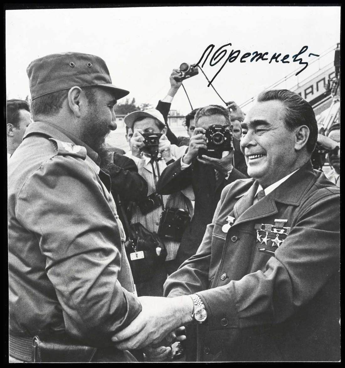 Brezhnev, Leonin (1906-1982). General Secretary of the Central Committee of the Communist Party of the Soviet Union (1964-1982). Signed B & W photograph with Fidel Castro. 6 ¼" x 7." No date (Brezhnev met with Castro on February 26, 1981). The two leaders smile and shake hands as press photographers click away.