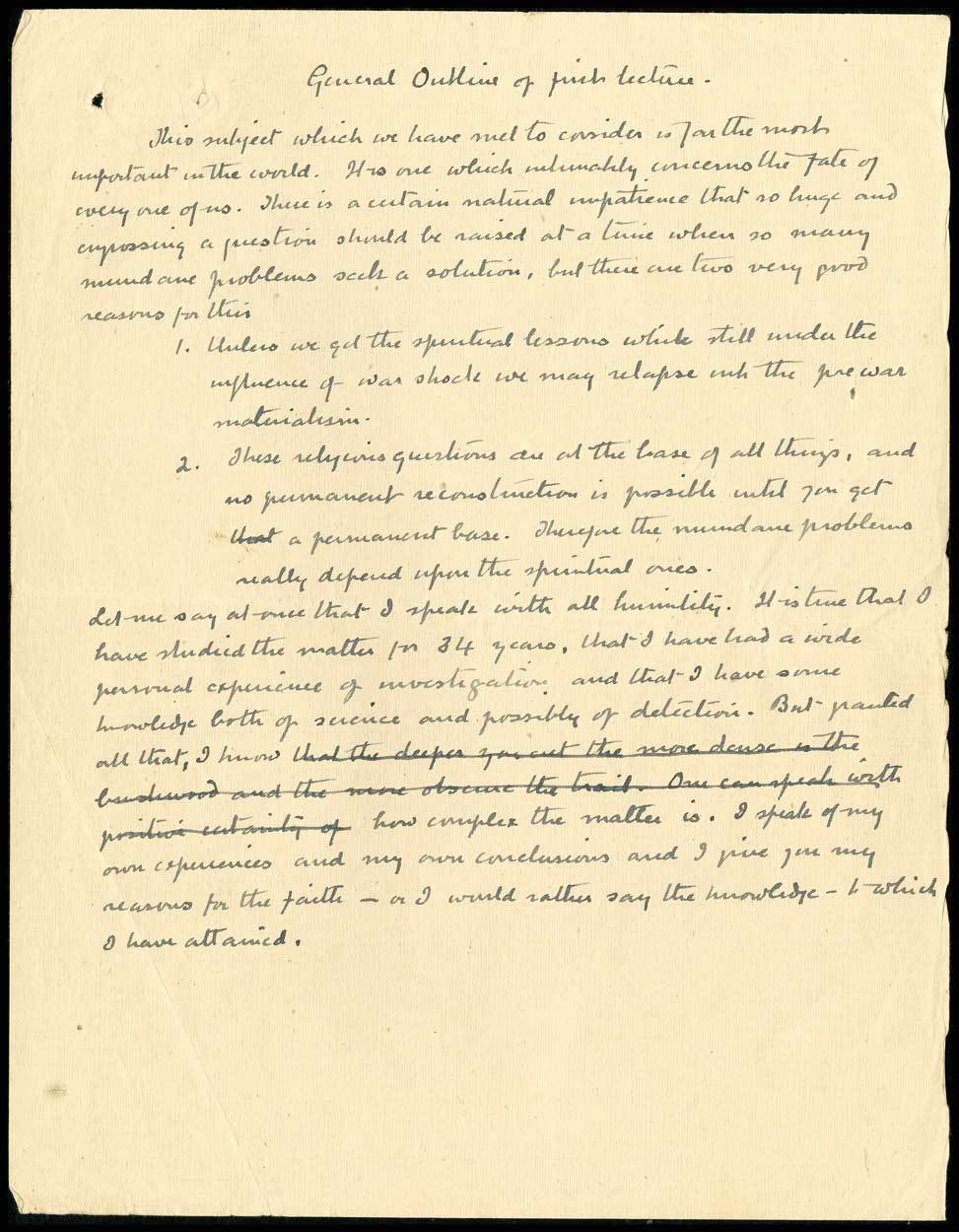 Doyle, Arthur Conan. Scottish author of detective and historical romance, best known as the creator of Sherlock Holmes. Rare Autograph Manuscript unsigned, written entirely in Doyle's hand. 4 1/5 pages, five 4to and one 8vo sheets, no place, undated (after 1917). At the head of the first sheet, the manuscript is entitled "General Outlines of first lecture.". Doyle begins by discussing the fundamental import of the questions addressed by spiritualism in the western world: "This subject which we have met to consider is far the most important in the world. It is one which ultimately concerns the fate of every one of us. There is a certain natural impatience that so huge and engrossing a question should be raised at a time when so many mundane problems seek a solution, but there are two very good reasons for this / 1. Unless we get the spiritual lessons while still under the influence of war shock we may relapse into pre[-] war materialism. 2. These religious questions are at the base of all things, and no permanent reconstruction is possible until you get a permanent base. Therefore mundane problems really depend upon the spiritual ones. Let me say at once that I speak with all humility. It is true that I have studied the matter for 34 years, that I have had a wide personal experience of investigation and that I have some knowledge both of science and possibly of detection. But granted all that, I know how complex the matter is. I speak of my own experiences and my own conclusions and I give you my reasons for the faith - or I would rather say the knowledge - to which I have attained…I appeal to you would I not be a stock and a stone if I were not convinced of spirit return - if I not know it - and if I did not devote all that is in me to getting other people to know it. Look at what it means. See how the shadow of death thins away until it is no longer a dark cloud but rather a sun-tinted haze. It is a grand support for a man who is in danger…". Doyle cites several examples, including: "There is immensely interesting dialogue, which is reported a verbatim by a stenographer, between Dr. Hodgson after his death, and his friend & collaborator Hyslop, who has now joined him, but was then alive. Mrs. Piper was the medium. Hodgson was using her mechanism, and was speaking direct to Hyslop, giving reference after reference to things between them which were unknown to Mrs. Piper…talking of his death he said 'It is delightful to go through the cool ethereal atmosphere…[of] this life and shake off the mortal body…It is all so much better than I anticipated.' He recommended prayer as an expansion of the soul.". With deletions and corrections in Doyle's hand. Doyle publicly announced his belief in spiritualism, which was strengthened by his son's wartime death in 1917. He expended a great deal of time and money to advance spiritualism - often lecturing as part of his efforts in this regard. This lecture manuscript offers fascinating and profound insight into Doyle's thoughts on the matter to which he was so devoted. Age-toning, fold wear, and file hole at upper left of each page. Otherwise Very Good. Accompanied by letter from James Lowe certifying authenticity of the manuscript.
