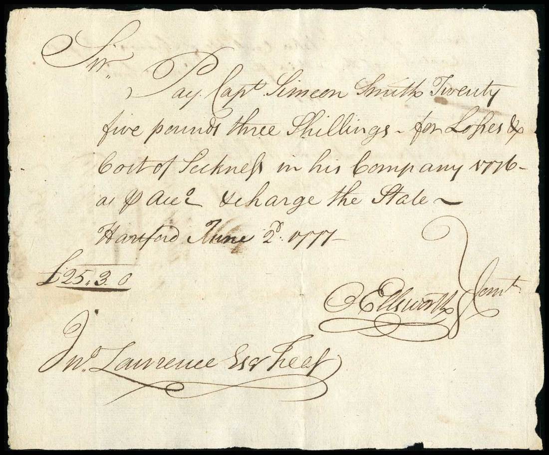 Ellsworth, Oliver (1745-1807). Lawyer, politician, drafter of the U. S. Constitution, U. S. Senator and Chief Justice of the Supreme Court. DS. 4vo. June, 2, 1777. To John Lawrence. Hartford, Connecticut. Signed by Ellsworth as Comptroller. Crisp, bold signature. "Pay Capt Simeon Smith Twenty five pounds three Shillings for Losses & Cost of Sickness in his Company 1776 as Paid & charge the State."