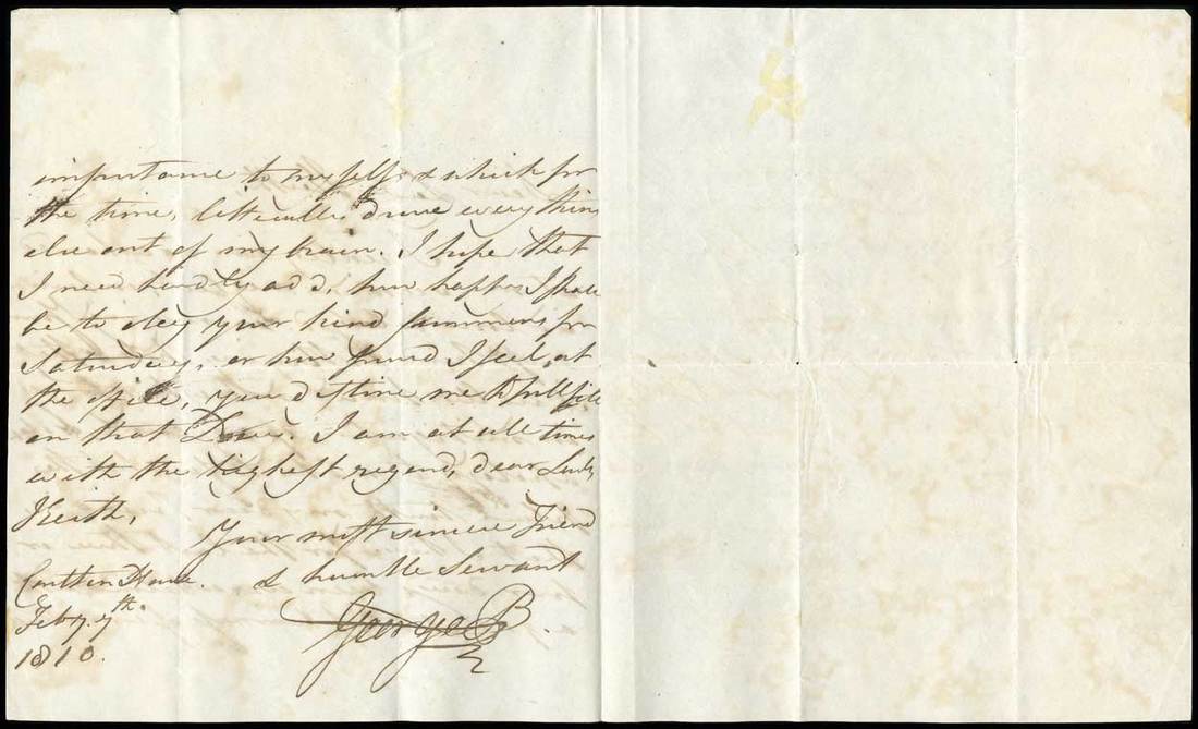 George IV. King of Great Britain, Ireland and Hanover (1820-1830). ALS. 2 pages. 4vo. February 7, 1810. To Lady Keith. Written a year before he would become Prince Regent, due to his father's mental illness.