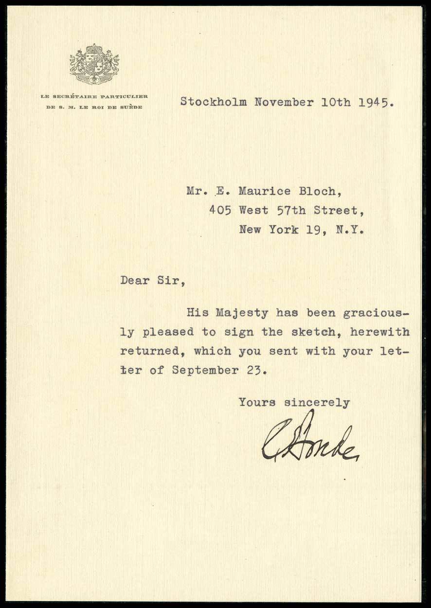 Gustavus V. King of Sweden (1907-1950). The last Swedish King to exercise his royal prerogatives. Black and white "sketch," ready for framing, sent to the King by E. Maurice Bloch to be autographed. With a typed note from the office of Le Secretaire Particulier, Stockholm, stating that "His majesty has been graciously pleased to sign the sketch…"