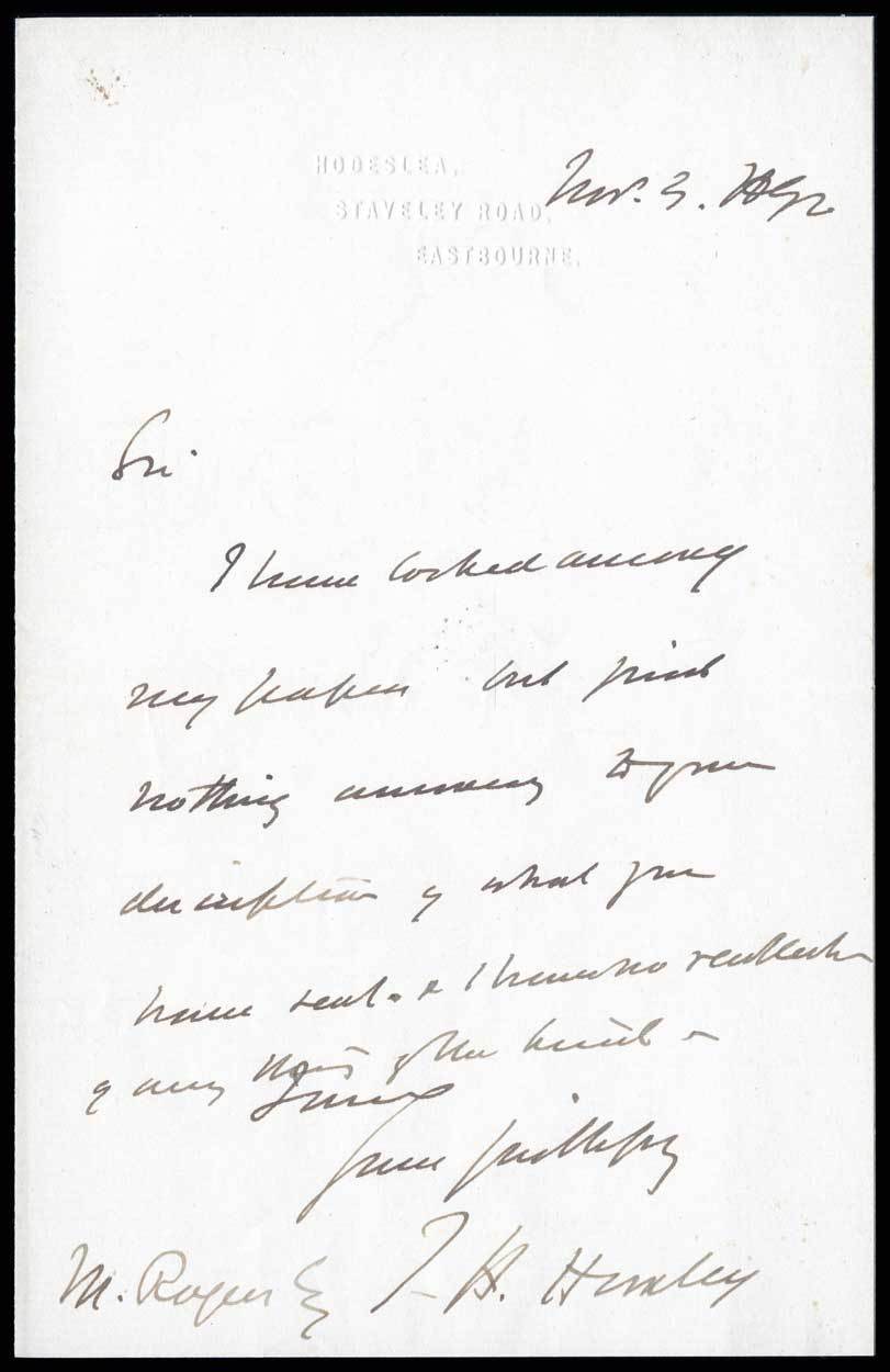 Huxley, Henry Thomas (1825-1895). British biologist and scientist who sailed as ship's doctor on the HMS Rattlesnake's voyage of exploration to New Guinea and Australia. Fellow of the Royal Society at the age 26. Huxley was a staunch supporter and defender of Darwin. ALS. 8vo. Nov. 3, 1892. Hodesly, Stavely Road, Eastbourne. "I have looked among my papers and find nothing answering to your description of what you have read…"