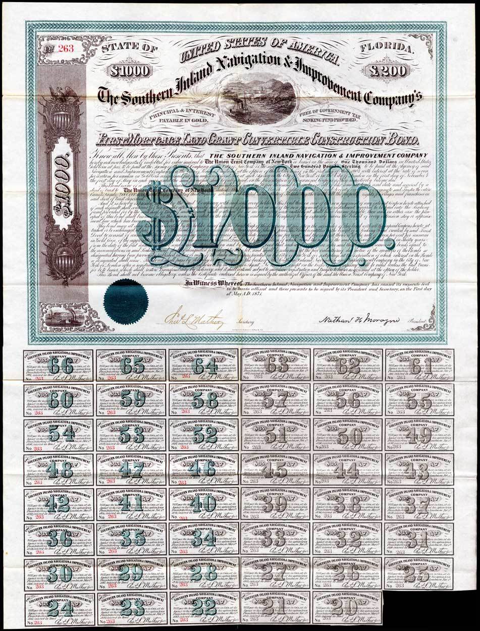 Southern Inland Navigation and Improvement Company (Florida) 1871. $1000 - 200 Pounds. First Mortgage Land Grant Convertible Construction Bond. No.263. Green frame and underprint. Ship coming down a river, hills in the distance. Steamboat, lower left. Cowan & Co. EF. 49 coupons. Fresh and bright. Issued, uncancelled.