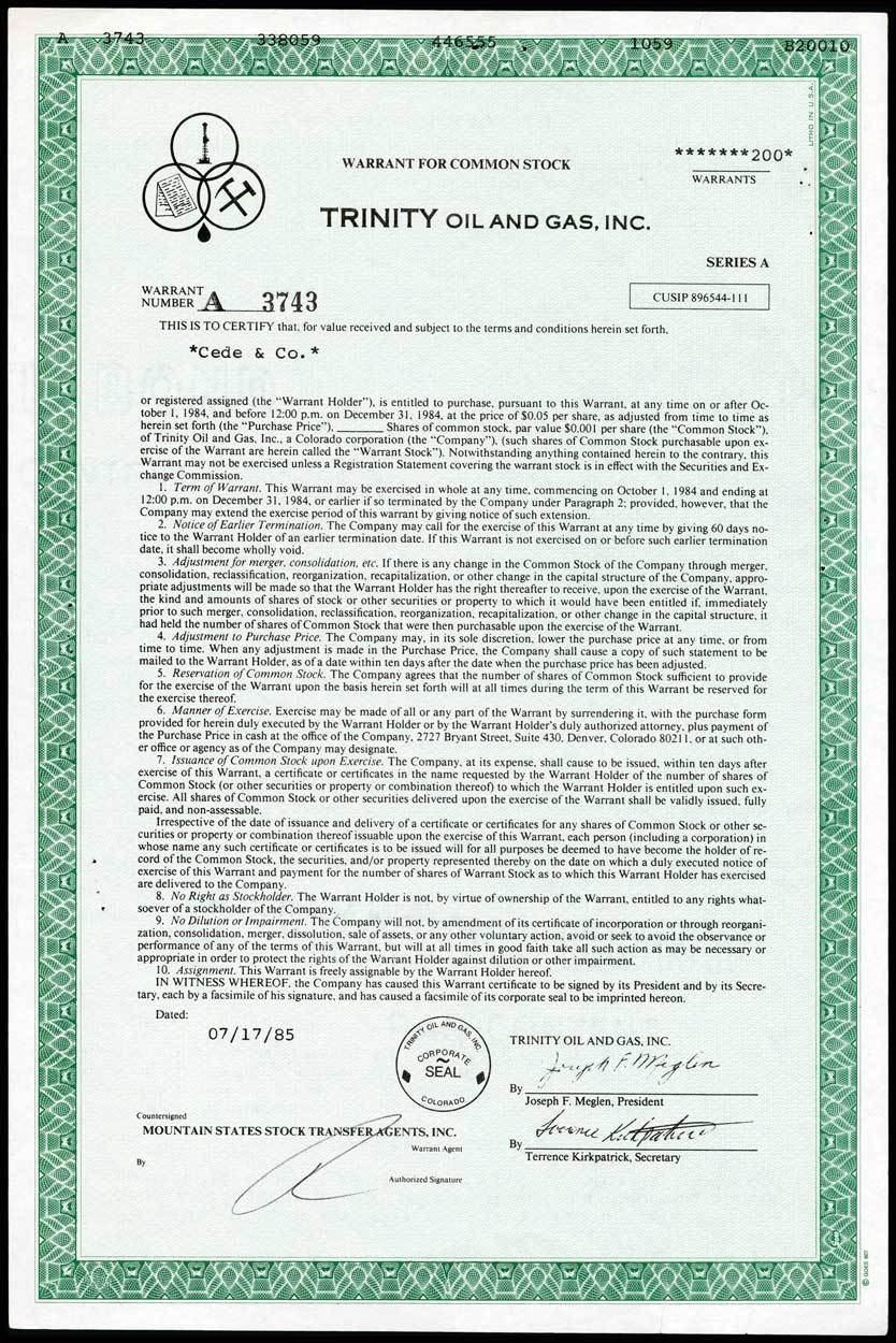 Trinity Oil and Gas Inc. (Colorado) 1985. VF+. According to our consignor, This company was an out and out fraud, similar in operation to Gulf Oil Drilling Supply and Gulf Coast Investment Group. These schemes depend on creating the impression that old wells, actually averaging one or two barrels a day, seem to be producing four to eight hundred barrels a day. Money laundering may also have taken place. Barry Seal, one of the founders, was a US drug smuggler and and dealer who flew flights for a drug cartel. An important example for any collector of fraud related certificates.