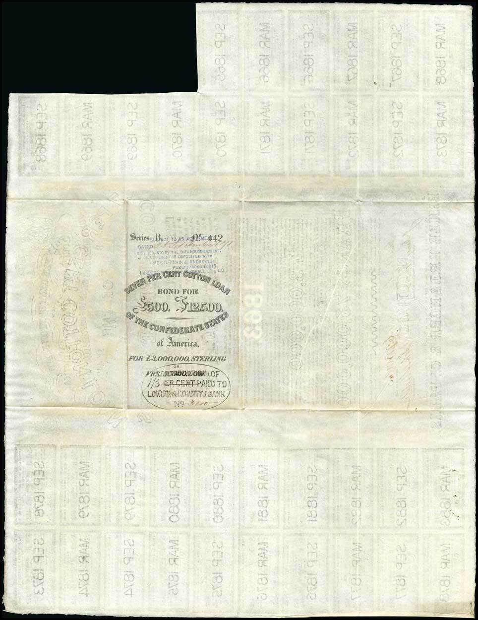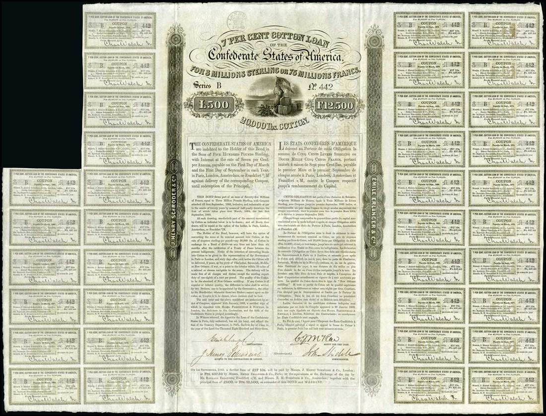 CSA Bonds. Ball 158. January 1, 1863. 500 Pounds - 12,500 Francs. No.442. Erlanger bond. Greyish-brown tint. Allegorical woman representing the Confederacy holds flag. Signed by Emile Erlanger as "CONTRACTOR" and John Slidell as "COMMISSIONER." 36 coupons. EF, and very choice for the grade.