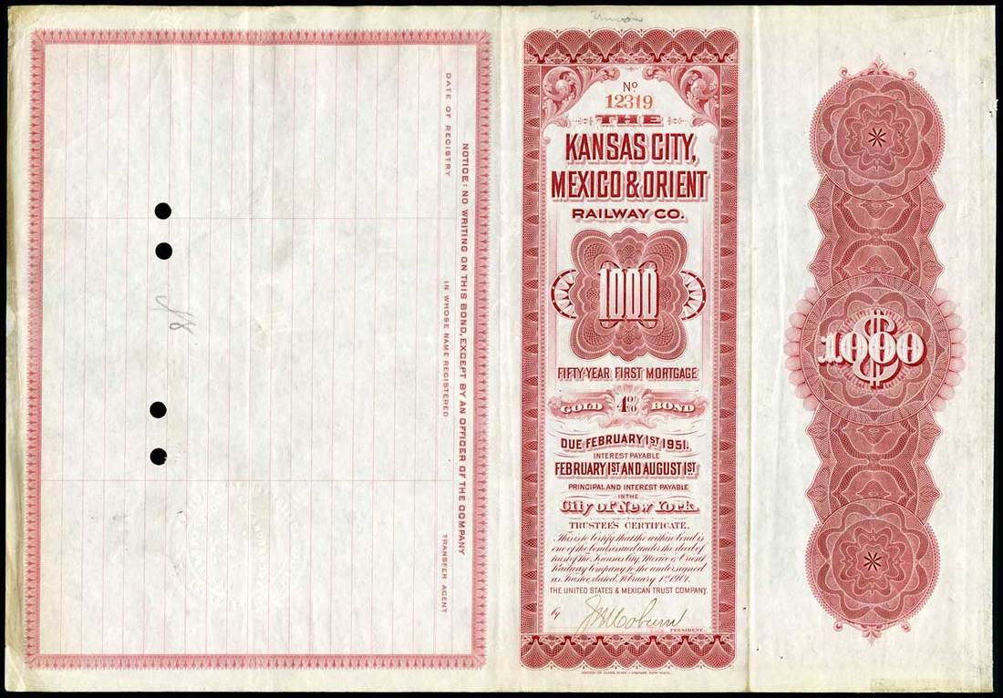 Kansas City Mexico & Orient Railway (KS), $1000 Fifty-Year First Mortgage Gold Bond, red borders, locomotive flanked by Mexican peasants, eagle and shield below, British one pound imprinted revenue stamp, ABN, issued, cancelled. Rarity 7 according to Cox, who lists only two other examples. Very Fine plus