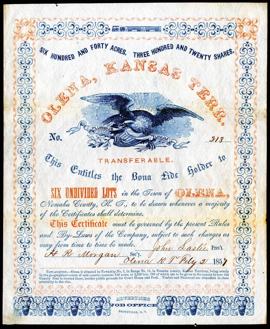 Bleeding Kansas Land Speculation Certificate (Kansas Territory) July 2, 1857. Olena. Six undivided lots. Isued, uncancelled. No.213. Red and blue throughout. Blue eagle, ""OLENA, KANSAS TERR."" above. ADVERTISING JOB OFFICE, BROWNSVILLE, N. T. VF+. Certificate for 6 lots in the town of Olena Kansas Territory dated February 2, 1857 and signed by John Laslie, President, with central vignette of eagle and small vignette of railroad train at top. Since no town of Olena exits today in Kansas, the exact purpose of this certificate is unknown but there are at least two possibilities. The 1857 date of the certificate suggests that it may be related to the Kansas-Nebraska Act of 1854 which left the decision of whether the then territories of Kansas and Nebraska would become slave or free states to a vote by the citizens. Pro-slavery and Anti-slavery forces poured into both territories which led to the violence of ""bleeding Kansas"" during a period from 1854 to 1861 which was a prelude to the Civil War. The purpose of this land, which may have been given away or sold for nominal prices, may have been to recruit anti-slavery settlers who would vote for Kansas to be a free state. A second possibility is that the promoters of this certificate were attempting to populate this area in the hopes that the Pacific Railroad, whose route had been debated in Congress for years, might be built in or near the location of the town, significantly increasing land values.