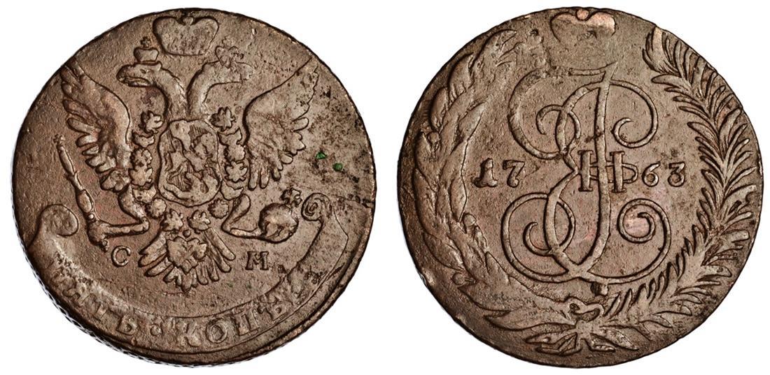 Russia. Catherine II, "the Great" (1762-1796). 5 Kopeks, 1763 CM. Sestroretsk. Crowned Imperial eagle, rev. Crowned Catherine II cipher with date in wreath. C.59.8. Very Fine.