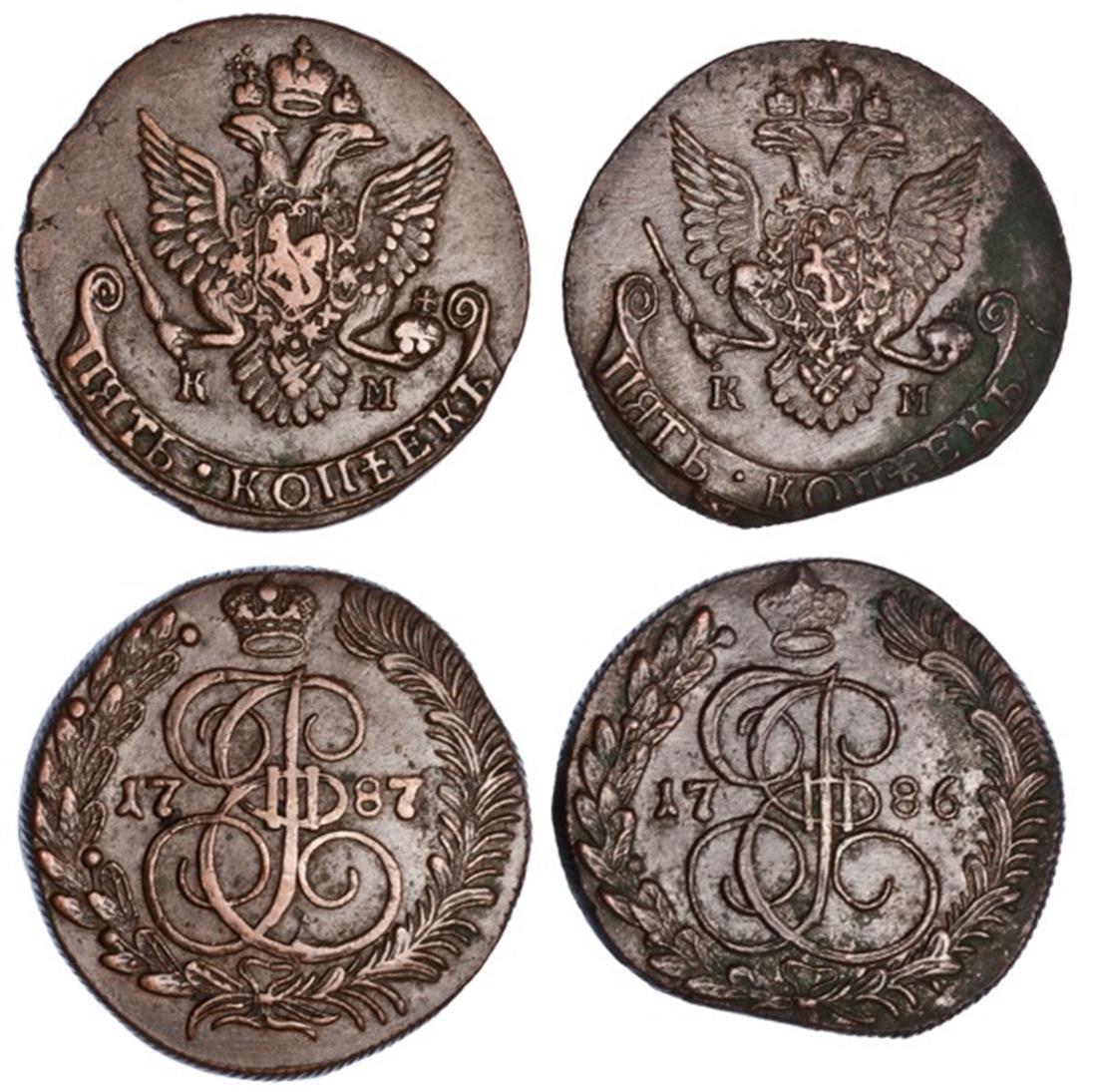Russia. Catherine II, "the Great" (1762-1796). Pair of Kolyvan 5 Kopeks, 1786, 1787 KM. Crowned Imperial eagle, rev. Crowned Catherine II cipher with date in wreath. C.59.5. The first irregular edge, light deposits. Extremely Fine, About Extremely Fine. (2)