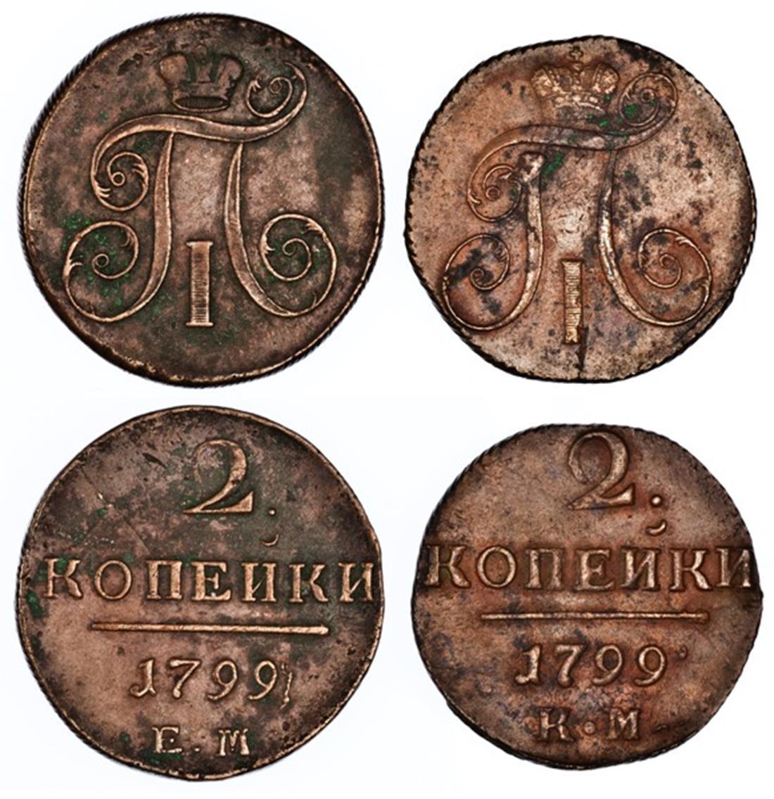 Russia. Paul I (1796-1801). Pair of 2 Kopeks, 1799. KM and EM. Kolyvan and Ekaterinburg. Crowned П I cipher. C.95.4, 95.3. Light deposits. Extremely Fine and Good VF. (2)