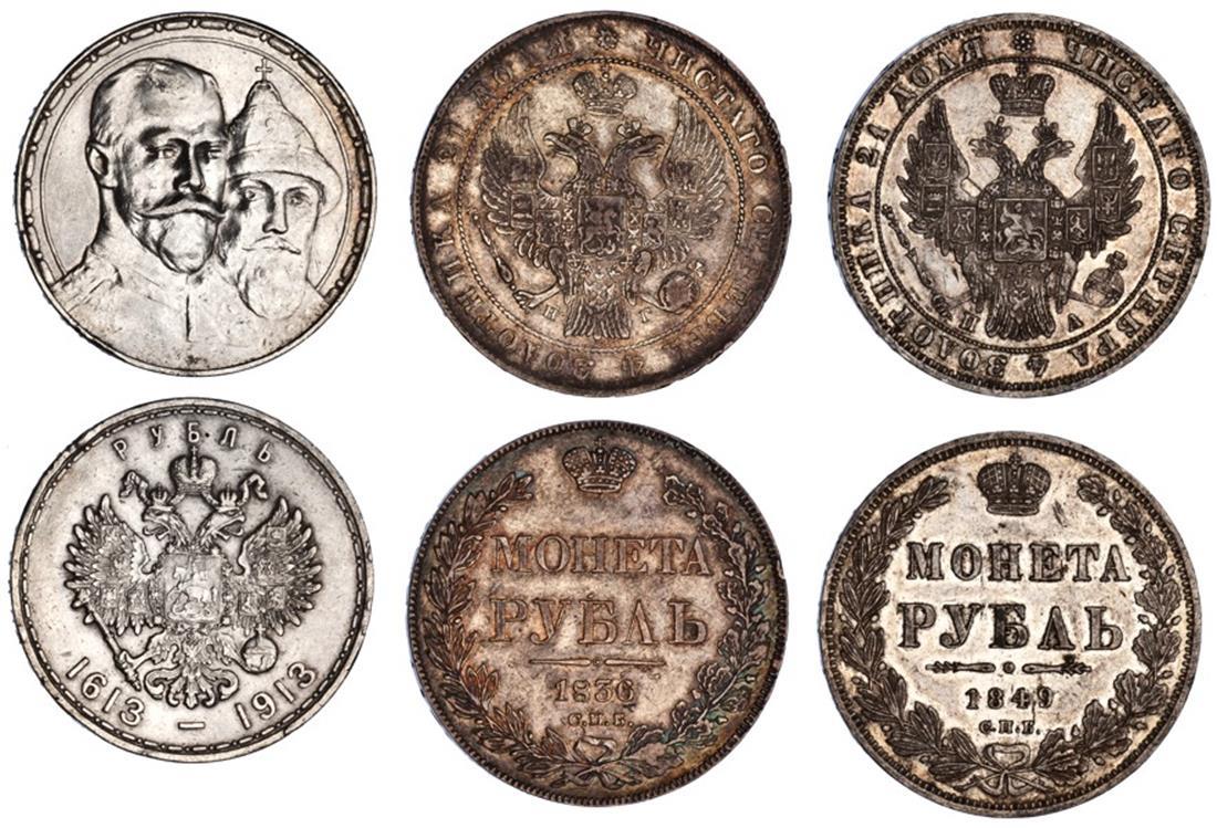Russia. Trio of Rubles: Nicholas I (1825-1855). Rubles, 1836 CПБ-HΓ and 1849 CПБ-ПA. Crowned Imperial eagle. C.168.1. The first with a few small edge tics. Very Fine and Extremely Fine; Nicholas II (1894-1917). Romanov Tercentenary Ruble, 1913 BC. Y.70. Extremely Fine. (3)