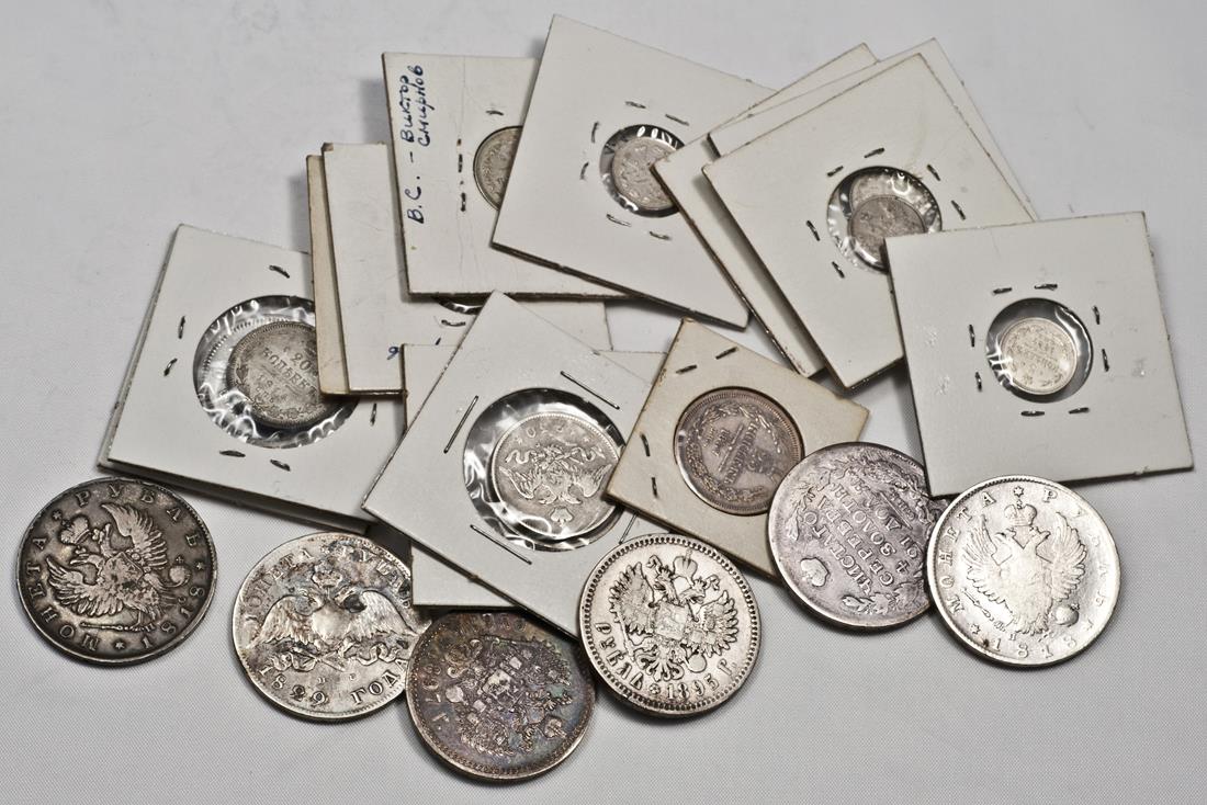 Russia. Nicholas I-Nicholas II. Small silver lot. Rubles, 1817, 1818 (2), 1829 (polished), 1895, 1897; 5 Kopeks, 1826, 1850, 1887, 1913 (2); 10 Kopeks, 1839, 1917 BC (2), 20 Kopeks, 1914; 25 Kopeks, 1830, 1857; 50 Kopeks, 1899, 1912 (both polished). Two of the Rubles cleaned, VG-VF, the minors generally Fine-EF. (19)